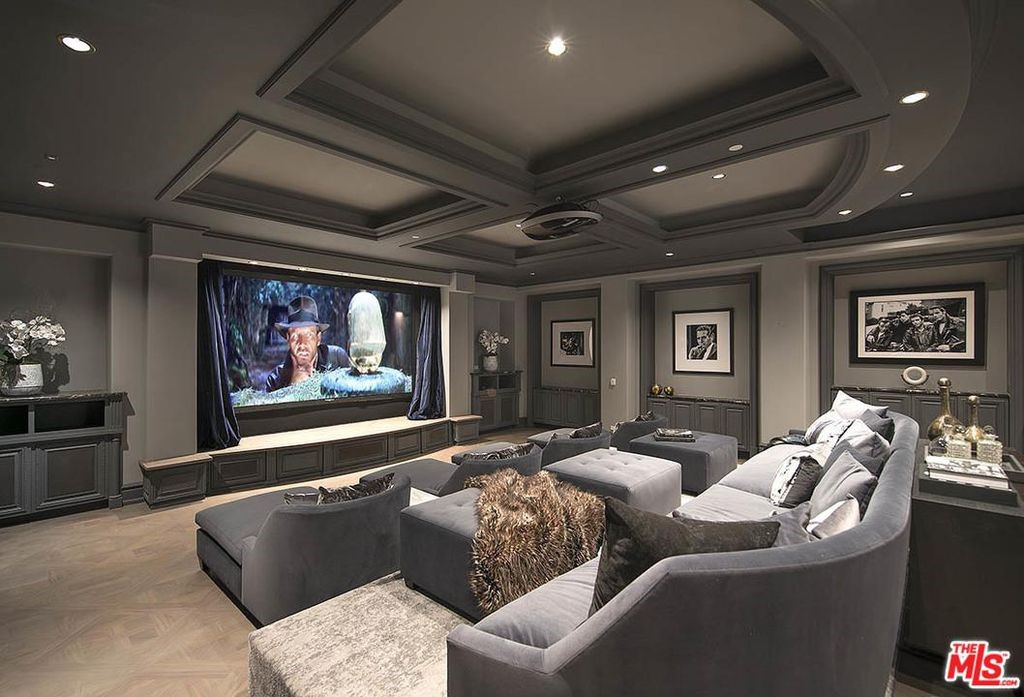 Sala de cine Moderna, tonalidades grises brillantes y azul