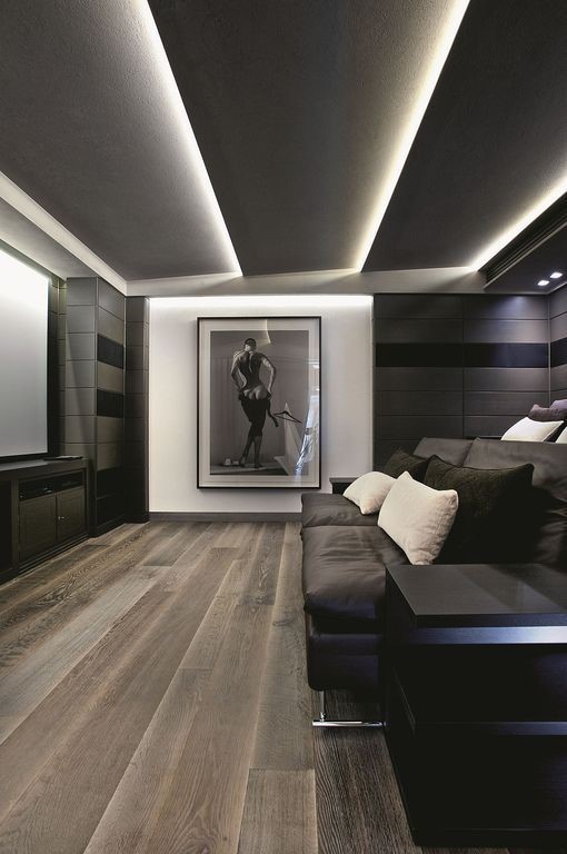 Salón de cine y televisión: estilo moderno sofás en tercipelo e iluminación indirecta en la pared tapizada